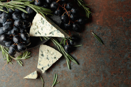 Blue cheese with grapes, and rosemary, on vintage background. Top view.