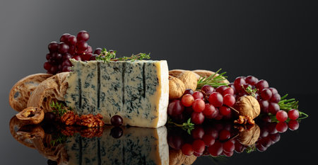 Gorgonzola cheese with ciabatta, walnuts, grapes, and aromatic herbs. Tradition Italian blue mold cheese on a black reflective background. Copy space.