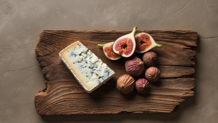 AI Generated. Blue cheese with walnuts and figs on wooden board in rustic setting