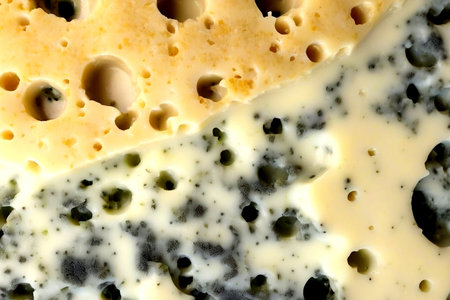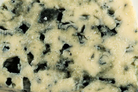 Blue cheese with holes close-up macro photography, selective focus.