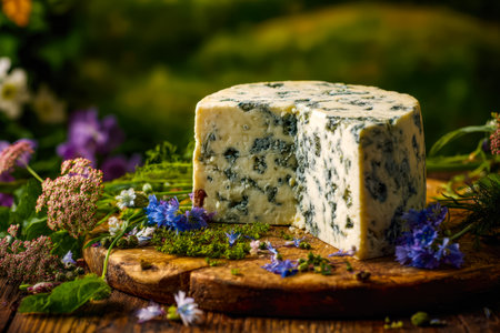 A vibrant assortment of blue-veined cheese rests atop a rugged wooden platter, surrounded by an array of bright wildflowers creating a charming, countryside scene.