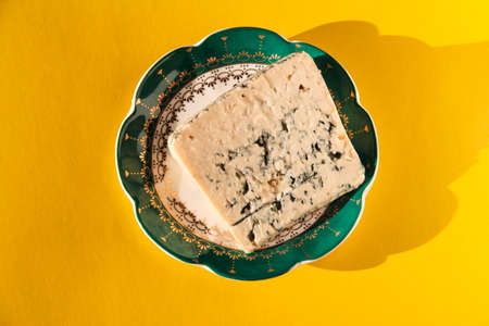 Cheese with blue mold on a plate and on a yellow background.