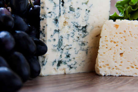Slice of blue cheese with grapes, close-up