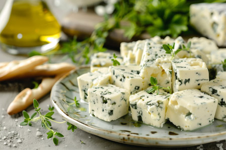A vibrant display of creamy blue cheese cubes garnished with sprigs of fresh herbs, surrounded by a rustic kitchen setting, evoking a sense of culinary artistry and flavor.