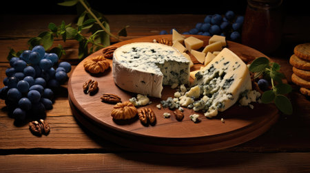 Wooden plate with assorted cheeses. Illustration by Generative AI.
