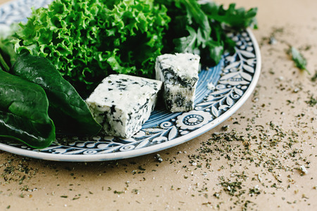 delicious fresh salad arugula spinach and gorgonzola cheese on amazing plate, space for text