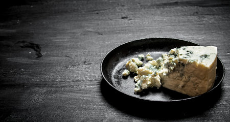 Danish blue cheese on black wooden background, with copy space