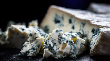 A piece of blue cheese reveals its distinct veined mold structures, showing creamy texture and rich color, set against a marbled dark surface, emphasizing its gourmet appeal.