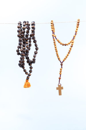Wooden rosary beads and prayer beads hanging on a string against a light sky
