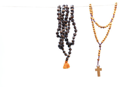 Rosary beads and mala hanging against a white background, symbolizing prayer and spirituality