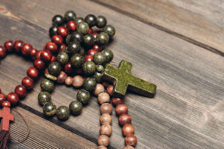 Wooden rosary with christian cross on wooden background