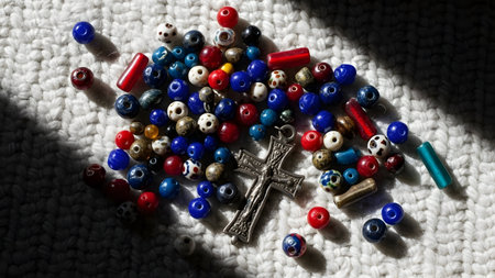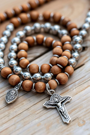 Capture the essence of spirituality with this stunning composition of beautifully crafted religious beads resting on a weathered wooden surface, illuminated by warm natural light.