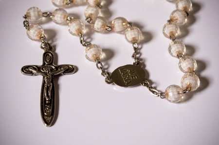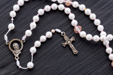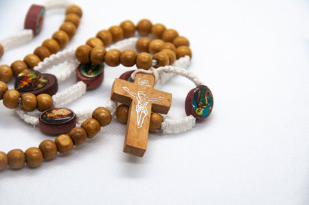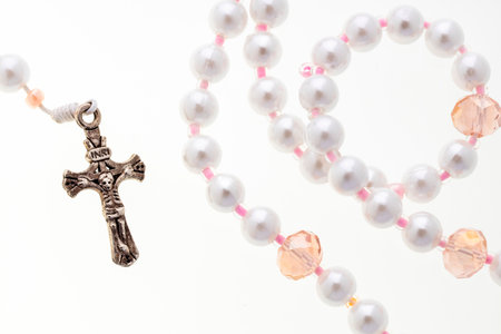 Holy Rosary on white background with customizable space for text. Copy space and Christianity concept.