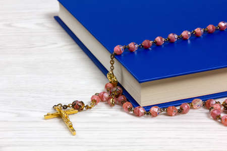 Rosary beads and prayer book. Rosary and book of Catholic Church liturgy on dark background.