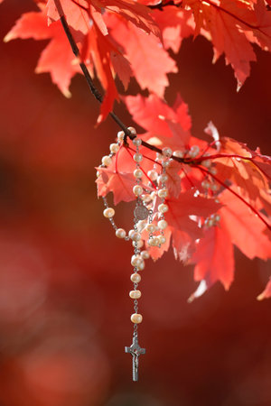 Rosary cross hanging on a tree branch with red leaves. Autum.