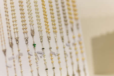 BOLOGNA, ITALY - FEBRUARY 18, 2019: lights are enlightening rosaries at stand of DUEBI in DEVOTIO Religious products and service exhibition