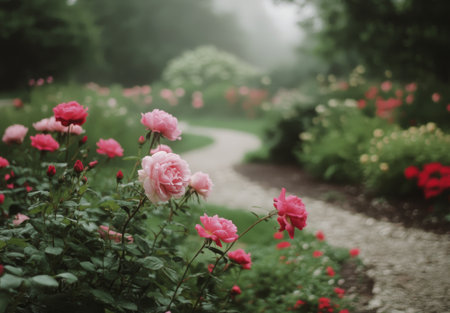 A peaceful garden features lush greenery and a winding stone path adorned with vibrant pink and red roses. Morning mist envelops the area, creating a serene atmosphere for visitors.