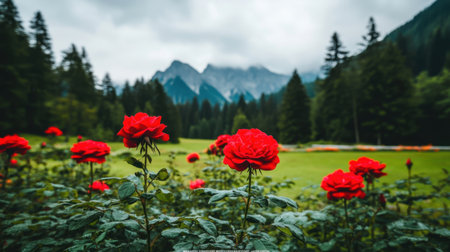 A stunning display of red roses in full bloom contrasts beautifully with the dramatic mountains in the background, creating a serene and picturesque scene.