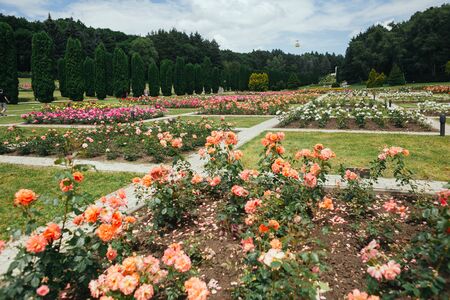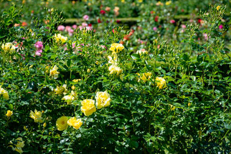 Blossom of colorful roses plants growing in castle garden in Provence, France, in sunny day