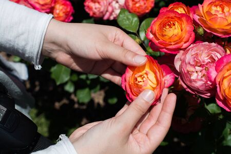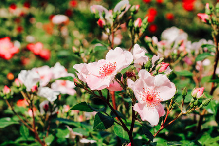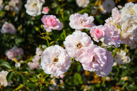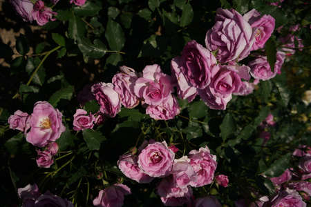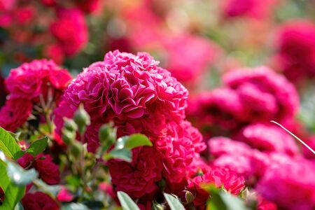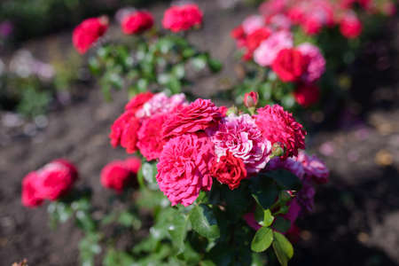 Colorful and vivid ornamental rose flowers in bloom. Nature background
