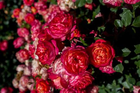 A close up captures a variety of roses in full bloom, bathed in sunlight, showing pink and red roses with lush green leaves.