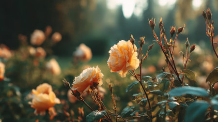 A stunning display of golden roses in a sunlit garden highlights the beauty of nature, with a soft focus that creates a serene and tranquil atmosphere. Perfect for floral themes.