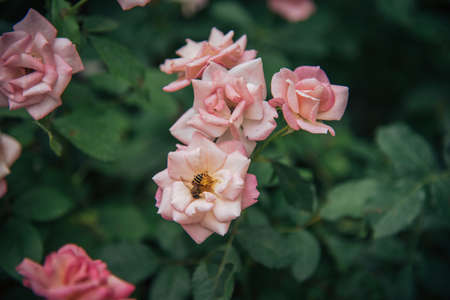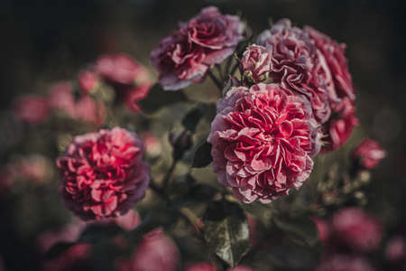 Pink roses in a full bloom in the garden. Close-up photo. Dark green background. Rose flower blooming on background blurry red roses flower