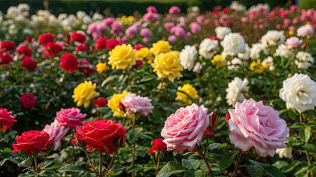 A lush garden filled with colorful roses in full bloom, surrounded by soft green foliage.