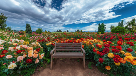 A wide-angle view of a colorful rose garden in full bloom, with a wooden bench placed in the center for a tranquil break.