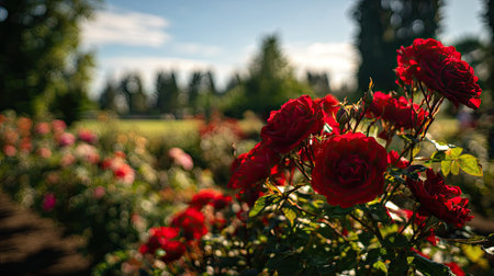 A peaceful rose garden surrounded by tall trees, with rows of vibrant roses blooming under a bright blue sky.