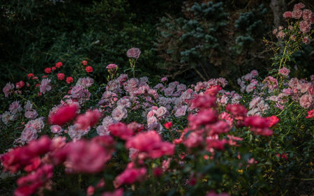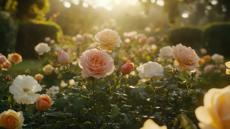 A stunning rose garden illuminated by the soft light of sunset, featuring vibrant orange and pink flowers amidst lush greenery, creating a tranquil evening atmosphere.