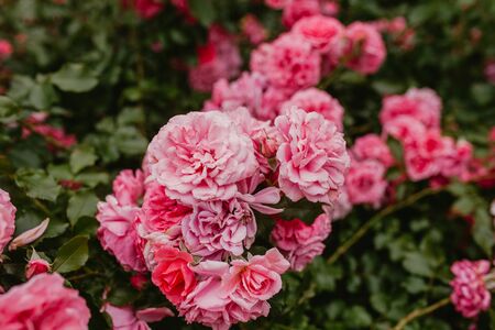 Bushes of red or scarlet roses against the background of pink roses. Flowering time, natural flower fence. Gardening, plants for landscape design.