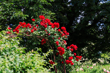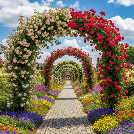 Bright red roses cascade from an arched trellis in a sunny garden. The scene is filled with vibrant colors and rich greenery creating a serene and inviting atmosphere for visitors enjoying nature.