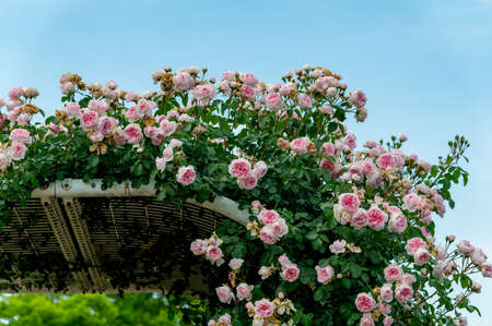 A yellow bush of a climbing rose on a background of a blue sky, a rose background
