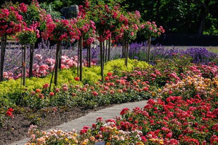 Botanical garden with color blossoms of flowers in summer hot sunny morning