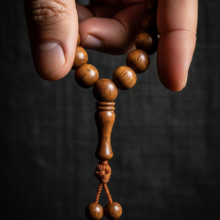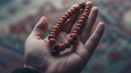 Close up of a hand holding wooden prayer beads, symbolizing spirituality, meditation, and religious practice.