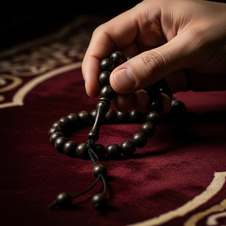 Beautifully crafted prayer beads displayed on an intricately designed carpet during a serene afternoon