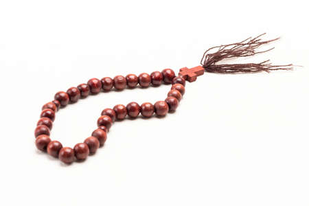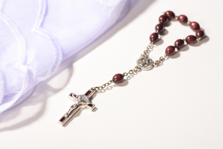 Close up of christian rosary beads with cross. Faith and prayer concept