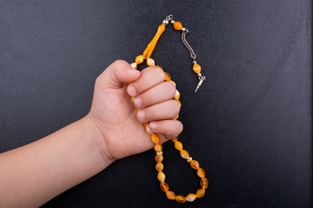 Man hand holding muslim rosary beads, tasbih over white background. Eid Mubarak Concept