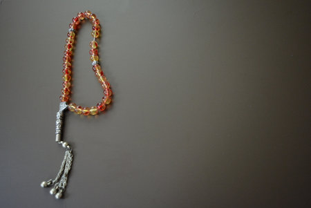 Necklace with a cross on a gray background. close-up Moslem beads from beautiful red yellow beads on a brown matte background