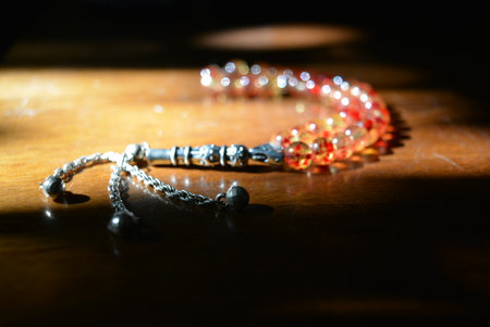 Necklace with beads on a wooden table. Selective focus. Muslim religious beads of yellow and red beads on a lacquered wooden table of old style lit by the rays of the sun.