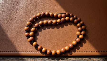 bold flat lay of meditation beads on a leather base, with earthy brown colors, serene skylight lighting radiance, soothing textures, high resolution