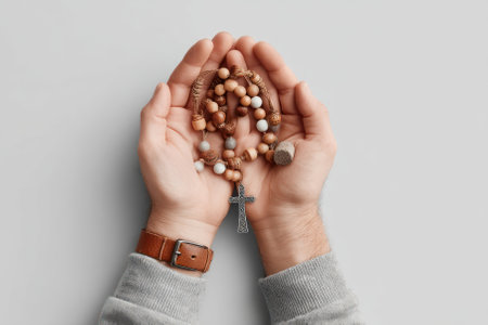 Close-up of male hands gently holding wooden prayer beads with a decorative cross pendant. The natural textures of the beads stand out against a clean, neutral background. This image symbolizes faith, spirituality, meditation, and inner peace, suitable for religious, spiritual, or wellness themes.