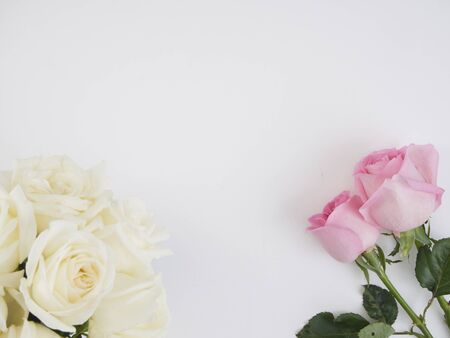 Valentines day background, white roses on white background. For card design and wedding. Top view, space for text