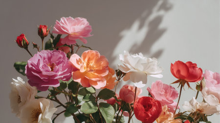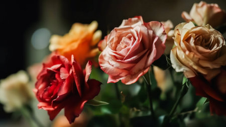 This stunning floral arrangement features vibrant roses in varied colors, creating a beautiful display perfect for home decor, artistic backgrounds, or romantic settings.