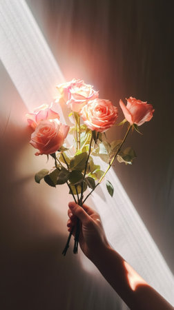 Young girl holding a beautiful spring bouquet flower arrangement with garden roses Color light pink Bright dawn or sunset sun : Generative AI