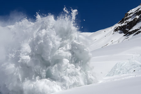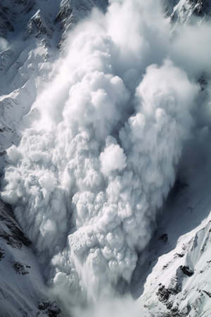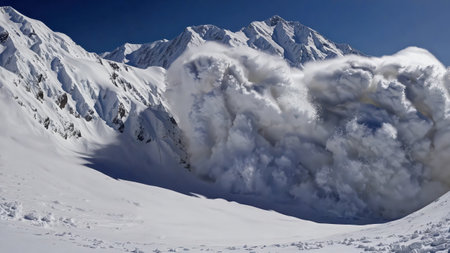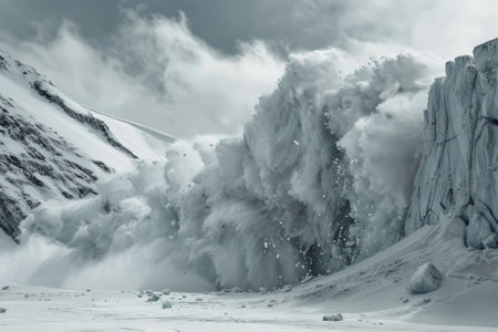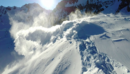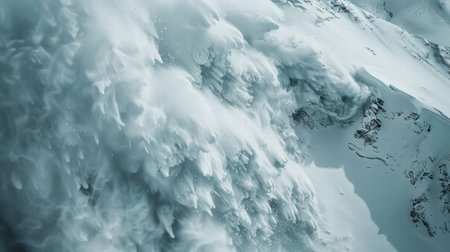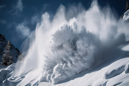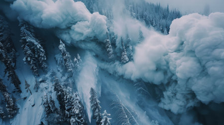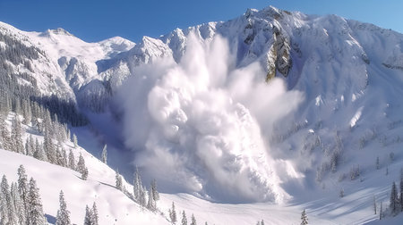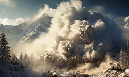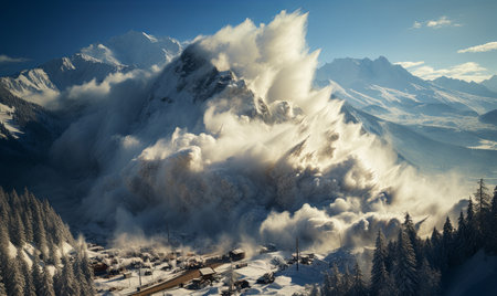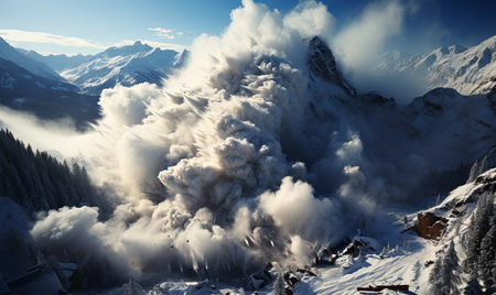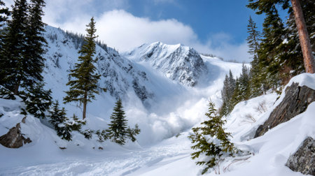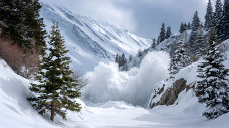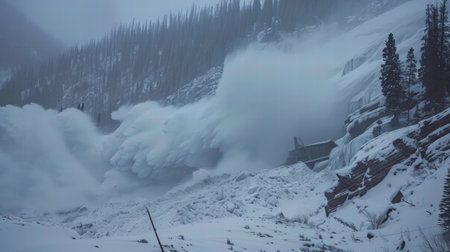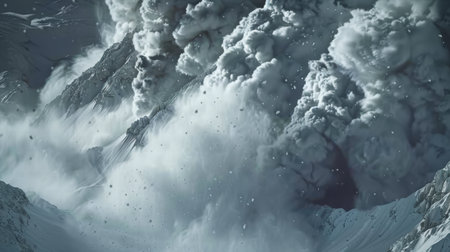 Snow cascades down the mountain slopes as an avalanche thunders through the valley below capturing natures raw energy.