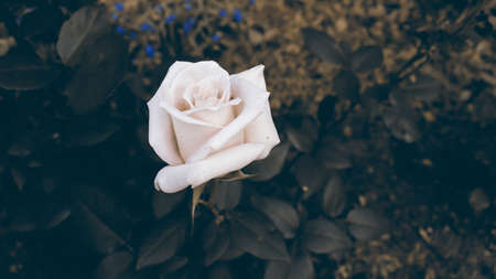 beautiful delicate white rose in the garden against a dark background in the rays of the sun