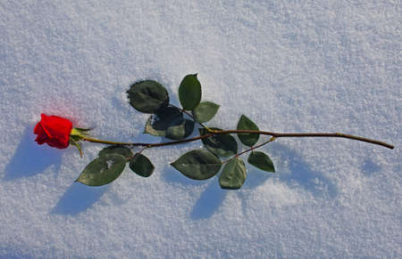Frozen red rose in white frost. Rose petals in small ice crystals surrounding the flower