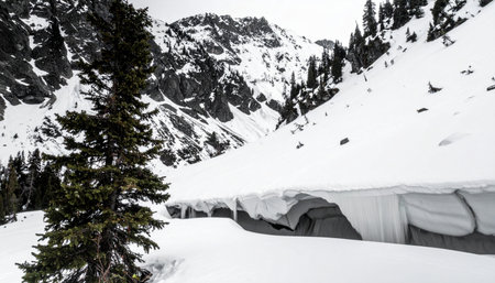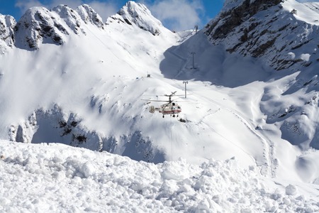 Mountain, avalanche and snow danger with natural disaster with destruction, emergency or climate